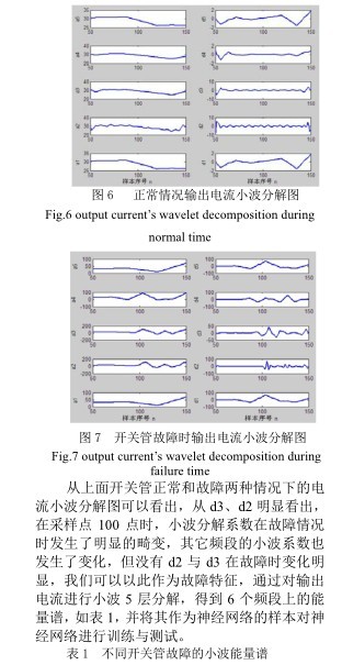 通过对比图 4、图 5 不难发现,在开关管发生故障时,输出电流发生了很大的畸变,通过 db3 小波对输出电流压进行 5 层分解, 提取 1个低频系数和 5 个高频系数,然后根据小波分解系数求出各频段能量谱,按照顺序排成一列向量,该向量就是与某一故障相对应的特征向量。下面对电压信号进行 5 层分解,得到 6 个频带的小波系数,重构各节点小波分解系数,则总信号可表示为[7]: