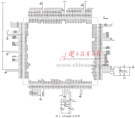 鄱阳湖的水质保护的重要性对水质检测提出了速度快 、测量准确的高要求。CPU是整个水质检测的“心脏”和 “大脑”。作为整个系统的中枢,接受所有来自水质传感器的信号和数据,并对各个数据进行处理,最终发送给GPRS模块。采用高性能的CPU芯片可以使水质检测的工作效率大大提高。本设计采用了一款三星公司的ARM 内核芯片S3C44B0, 其工作效率是普通8位单片机的 4~5倍 ,非常适合于水质参数的处理。S3C44B0是基于ARM7TDMI-S内核的一款CPU,32位宽度的存储器接口和独特的加速结构使代码能够在最大时钟速率下运行。从整体性能看,采用S3C44B0芯片设计的原因在于其速度快、调试方便、运行稳定。S3C44B0与其他外部设备连接信号线如图2所示。