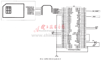 其电路设计如图4所示,该模块大部分引脚可以不必接,只需要注意SIM卡信号和串口信号,只要这两部分电路接好,GPRS硬件模块就可以正常工作了。