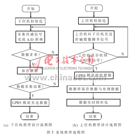 在线水质监测系统软件的两大部分:下位机程序和上位机程序。设计流程分别如图5(a)和图5(b)所示。