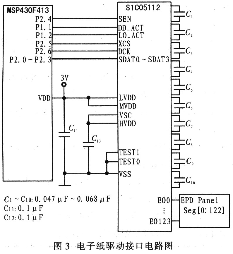 图3为系统硬件连接图,电子纸需要专门的驱动器方可驱动显示,本设计的电子纸驱动器件采用EPSON公司生产的S1C05112,S1C05112内置接口电路和驱动电子纸模块,采用3 V供电,便于与MCU通信。电子纸驱动模块分别与MCU的I/O 口连接。通过I/O模拟电子纸驱动模块时序图。主控制器通过软件实现电子纸驱动模块的初始化启动、刷新显示和关断。