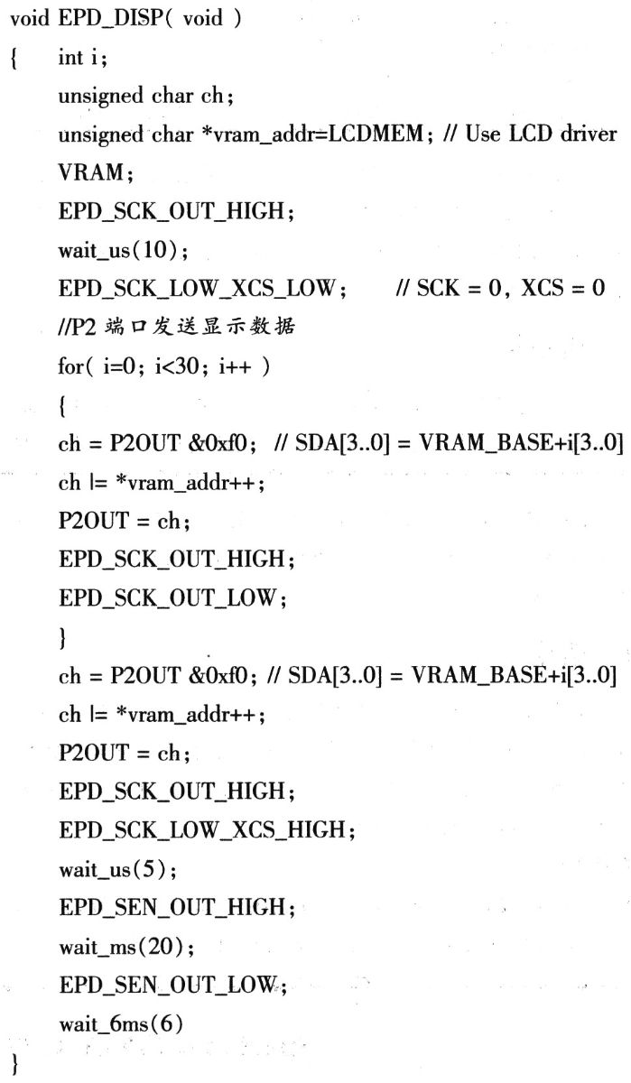 该函数读取LCDRAM中的数据,通过查询LCDRAM中的数据然后直接送到I/O端口,电子纸驱动器件获取显示数据后刷新电子纸。其相关程序代码如下: