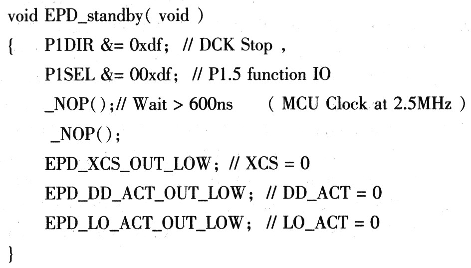 通过配置电子纸驱动的电源模块将其功耗降至最低,即拉低电子纸驱动的配置位DD_ACT和LO_ACT,电子纸驱动器件处于待机状态。此时电子纸仍可显示,包括掉电时。