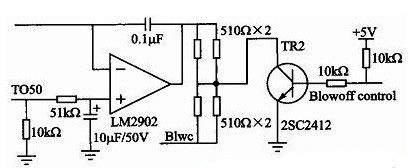 鼓风机驱动电路如图6所示。用四合一集成运算放大器LM2902将单片机的PWM输出信号T050放大,经放大后的信号Blwc传送给风机调速模块,从而调节鼓风机的转速。单片机输出信号Blowoff control作为控制鼓风机的开关信号。2SC2412作为控制鼓风机运转的开关。当单片机输出高电平时,2SC2412导通,鼓风机停止运转;当单片机输出低电平时,2SC2412反向截止,鼓风机正常运转。