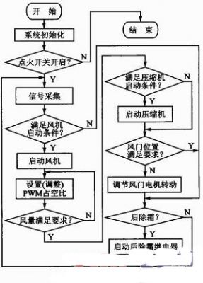 空调控制模块主要包括信号采集模块、风门电机控制模块、鼓风机控制模块、压塑机控制模块、后除霜控制模块5个子模块。空调控制流程如图9所示。首先,进行系统的初始化。若点火开关正常启动,信号采集模块开始采集传感器数据,根据采集到的数据,判断是否满足风机启动条件。若满足条件,则设置风机PWM占空比,进而调节风量的大小。当风量大小满足要求时,接下来就要判断是否满足压缩机的启动条件。若满足条件,启动压缩机;如果不满足条件,则判断风门位置是否满足条件。如果不满足条件,则调节风门电机转动,直到满足条件。最后,判断是否满足除霜条件,若满足则启动后除霜继电器。