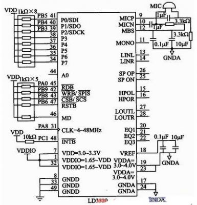 参照LD3320数据手册,语音识别控制电路采用LD3320与STM32通过SPI串行方式进行连接。语音识别模块控制电路如图2所示。首先,要将MD接高电平,芯片时钟信号CLK连接到STM32时钟信号输出引脚MCO(PA8)上。引脚MBS是麦克风偏置,接了一个RC电路,保证能输出一个浮动电压给麦克风。