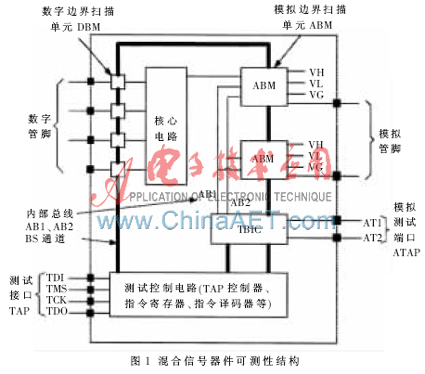 IEEE1149.4标准继承了IEEE1149.1标准的设计思想,它在模拟管脚上施加与数字边界扫描单元(DBM)相似的模拟边界扫描单元(ABM),将它们与数字边界扫描单元一起依次串联成边界扫描寄存器链,为测试指令和数字测试数据提供串行移位通路。为满足模拟管脚测试的要求,标准专门在芯片内部添加了两条内部模拟测试总线即AB1、AB2。各模拟边界扫描单元通过概念开关与内部模拟测试总线相连,内部模拟测试总线上的模拟信号可在测试总线接口电路(TBIC)的控制下,与模拟测试接口(ATAP)通信。而模拟测试接口则是外界模拟信号源、模拟测试响应处理器与模拟边界扫描器件的接口,这就构成了一条虚拟探针形式的模拟信号通路,外界模拟测试信号可通过这条模拟信号通路施加到某一模拟管脚上,模拟管脚上的模拟数据也可通过这条模拟测试通路输出到外界,由模拟测试响应处理器处理。模拟测试总线、模拟测试边界扫描单元以及模拟测试接口构成IEEE1149.4 标准的主要特征。