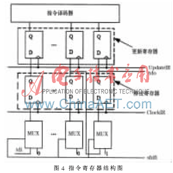 指令寄存器设计结构如图4,指令寄存器采用一种移位/更新寄存器结构。这种结构在时钟信号ClockIR的激励下,以串行方式将指令从tdi逐位移入指令寄存器IR中,并从tdo 输出;在更新信号UpdateIR 的激励下,移位寄存器中的指令将装入更新寄存器(指令锁存器)中,指令锁存器中的指令经译码后,配合tms 信号产生控制边界扫描电路的各种控制信号。