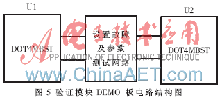 为检测所设计的可测性结构是否可行,在测试验证中将所设计可测性结构进行了硬件的实现,构成了一个验证模块DOT4MBST,并以此为主要构成部件设计了验证模块DEMO板。DOT4MBST中设计了2个模拟边界扫描单元、4个数字边界扫描单元,内核电路数字部分为一个半加器,而模拟部分为一个射随器,模块边界扫描链长度设置为16位。