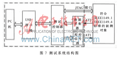 测试验证所用的测试系统是桂林电子科技大学CAT研究室开发的混合信号边界扫描测试系统。该系统是一套兼容IEEE1149.1标准和IEEE1149.4标准的测试系统,是“十五”国防预研项目的研究成果之一,已经通过专家鉴定和验收,它能对符合IEEE1149.1及IEEE1149.4标准的被测对象进行各种边界扫描测试[4-5]。