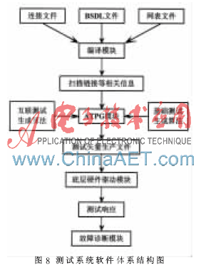 软件部分的主要功能是根据提供的电路连接信息文件、BSDL文件及网表文件生成测试矢量并进行故障诊断。混合信号边界扫描测试系统的软件体系结构如图8所示。