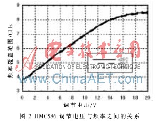 本文选择Hittite公司的PLL芯片HMC702,该芯片内置了R分频器、鉴相器和N分频器,最高支持14 GHz的频率,相噪杂散水平也十分优异,有小数模式和整数模式可供选择。而VCO的选择,根据频率范围,选择HMC586。它是一款MMIC宽带VCO,图2为其调节电压和频率之间的关系图,从图中可以看出其可以覆盖4 GHz~8 GHz[1]。