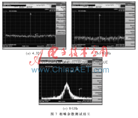 接着测量相噪杂散水平,为了证明其宽带变频和10 MHz的频率分辨率,分别给出4.32 GHz、6 GHz、8 GHz的测试结果,如图7所示。其中图7(a)为4.32 GHz,span为100 kHz,RBW为100 Hz,所以此时相噪为-88.2 dBC/Hz@10 kHz;图7(b)为6 GHz,span为100 kHz,RBW为100 Hz,所以此时相噪为-95.4 dBC/Hz@10 kHz;图7(c)为8 GHz, span为20 MHz,RBW为10 kHz,可见此时出现了-62.7 dBc的杂散,此杂散偏离中心频率5 MHz为鉴相频率泄露造成。