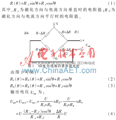 各向异性磁阻效应是指铁磁金属或合金的电阻随磁化方向和电流方向夹角的变化而变化,当夹角为0°时,电阻最大。ARM传感器用4个磁电阻组成惠斯通电桥实现输出电压随电阻的变化而变化[2],如图1所示。设偏置磁场H与R1夹角为θ,则H与R2夹角为(90°-θ)。磁电阻的变化服从式(1):