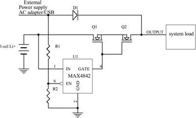 另外,MAX4842的过压保护门限为4.4V-5.0V,也高于单节锂电的4.2V上限电压。电源切换电路是利用MAX4842的使能控制引脚/EN配合分压电阻R1/R2实现的。当没有外部电源接入时,如果电池电压高于2.8V-3.2V的保护门限,/EN被R2拉低,MAX4842驱动Q1、Q2的栅极为高电平使其导通,电池为负载供电;当有外部电源接入时,通过R1/R2分压后在/EN引脚上产生的电压高于1.47V后MAX4842被禁止,Q1、Q2被关闭,由外部电源给负载供电。图中的二极管D2用于阻断灌入外部电源的反向电流,并防止/EN被错误拉高。由于它串在外部供电通路上,损失一点效率没有关系。