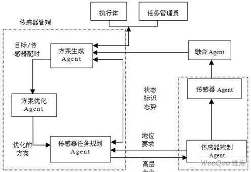 ⑸传感器控制Agent:是一个转换模块,负责把传感器分配方案转换为传感器可执行的命令,同时还完成传感器的模式选择、参数选择等具体操作。