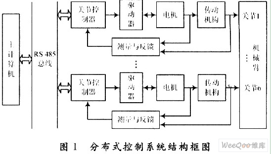 考虑到机械臂控制系统控制算法的计算量以及多轴协调控制等问题,采用基于RS 485总线的分布式控制的体系结构,见图1所示。运动规划算法由主计算机来实现,同时主计算机还将通过RS 485总线与各关节控制器通信,负责各关节控制器的协调工作。每个关节控制器和一台电机、驱动器、检测反馈装置等构成一个位置伺服系统,负责机械臂某一个关节变量的具体控制任务。