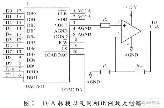 驱动器的控制模式可以分为两种:速度控制模式和位置控制模式(通常用电位器作为电机的位置传感器)。这里采用它的速度控制模式,输入的指令信号是0~10 V的模拟量。因此需要用D/A转换电路,把DSP输出的数字量给定转变为模拟信号,电路图如图3所示。DAC7621为12 b并行输入的D/A转换器,它内置参考源,输出范围:0~4.095 V。它的12位输入接DSP数据总线中的D0到D11。它的片选输入管脚可以接DSP的I/O控制线/IS。为了得到0~10 V的模拟信号,还要利用LM358中的一片运算放大器构成的同相比例放大电路,把0~4.095 V的信号放大2.5倍。