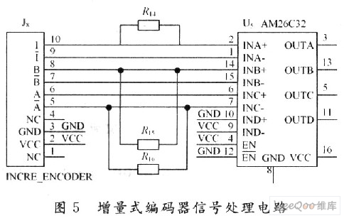 增量式编码器信号处理电路如图5所示。J8是MR编码器的信号输入接口,采用AM26C32把MR编码器输出三个通道的RS 422差分信号转换成TTL电平,得到A,B,Z三路信号。