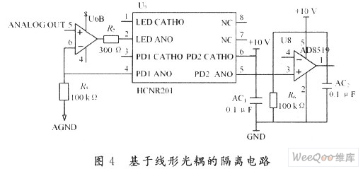 如果驱动和控制器不进行隔离,尖峰将破坏控制器电路中的器件,例如RAM。因此,设计了基于线形光耦HCNR201的隔离电路,如图4所示。