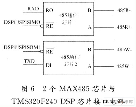 RS 485总线是一种通信总线,TMS320F240 DSP芯片本身不具备RS 485总线接口,采用两个485通信芯片MAX485可以的把TMS320F240的串口RXD和TXD的TTL电平转换为RS 485电平,TMS320F240DSP的RXD和TXD引脚分别连接到第一片485通信芯片RO和第2片485通信芯片DI的引脚。TMS320F240 DSP 的SPISIMO和SPISOMI连接到MAX485的使能引脚RE,用于控制TMS320F240 DSP芯片的数据发送口挂接到总线上或和总线分离,电路如图6所示。