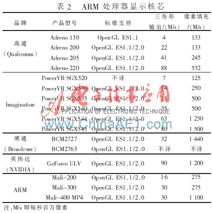 MID数字互联网的多媒体应用,要求ARM处理器不仅要有高性能的处理核芯,同时要集成优秀的显示核芯。目前市场上显示核芯主要有高通(Qualcomm)的Adreno系列、Imagination的PowerVR系列、博通(Broadcom)的BCM系列、英伟达(NVIDIA)的GeForce ULV系列及ARM的mali系列等。ARM处理器显示核芯如表2所示。