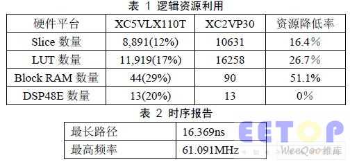 本文系统的实现主要用到了两类逻辑资源来优化系统性能: DSP48E Slice:25x18 位二进制补码乘法器能产生48 位全精度结果。此功能单元还能够 实现诸多DSP 模块如乘累加器、桶形移位器、宽总线多路复用器等。