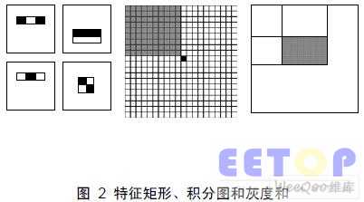 本文采用了一种像素积分单元阵列的结构来实现对图像进行人脸检测的并行性处理 [4,5]。该阵列的计算对象为Haar 特征。该特征被抽象为各种尺寸大小的矩形。一系列的矩形 组合起来即被用来表征人脸。黑白矩形内像素的灰度值经过加权求和后即为该特征的特征 值。积分图ii 的定义是: