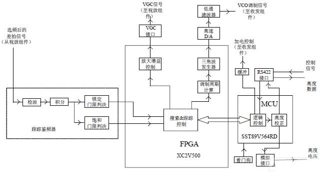该高度表的软件设计包括两部分:一部分是FPGA 的编程,采用VHDL 语言编写;另一部 分是MCU 的编程,采用汇编语言编写。两部分软件共同实现高度表的搜索、跟踪等功能。