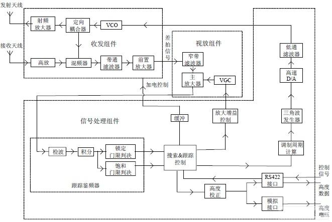 收发组件采用自差结构,输出为零中频的差拍信号,其频率跟地面高度成正比。VCO 的 调制带宽最高可达200MHz,调制线性度优于1.2。组件的接收增益30dB,噪声系数3.5dB。 视放组件对差拍信号进行选频放大,总增益不低于80dB,增益控制范围不低于90dB。