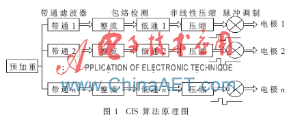 连续交替取样语音处理方案CIS(Continuous Interleaved Sampling)[4]是美国学者Wilson于1991年提出的对压缩模拟法的改进方案,它使用非同时交替脉冲来避免各语音通道间的相互影响,其原理如图1所示。语音信号预加重后由一组带通滤波器分为4~8个通道,每个通道经过全波整流、低通滤波可以得到各通道的包络信号;再用对数或平方律压缩到适当的动态范围;最后,由一组时间上交替的双相脉冲序列调制对应的包络信号,从而获得各电极的刺激脉冲。CIS方案通过利用交替的刺激脉冲,有效地克服了通道之间的相互干扰;同时,对每一个通道而言,它还具有相对较高的刺激速率,因为相邻通道间的脉冲时延很小,可以达到较高的刺激速率,CIS方案能更好地跟踪语音信号的细节变化。国外主要的人工耳蜗产品均采用该方案。