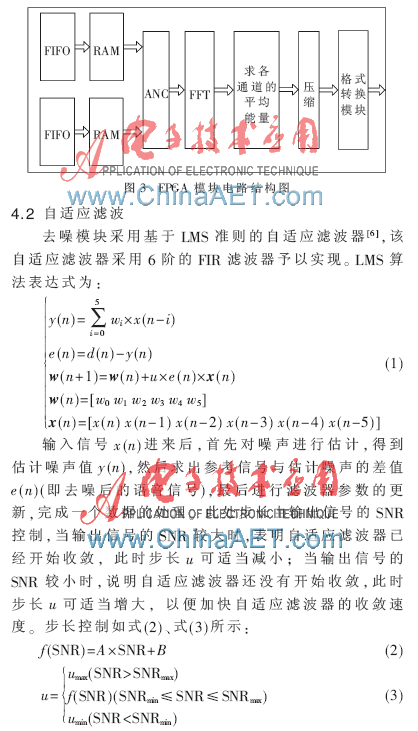 麦克风采集进来的语音数据用FIFO进行分帧处理。由于语音信号具有短时稳定性(约为10 ms~30 ms),又因为后面在频域上进行频带划分滤波,所以帧长取为256,既满足语音信号的短时平稳性,又利于后面的FFT计算。采集的两路语音信号通过ANC(自适应滤波器模块)去噪,然后把去噪后的语音信号做256点的FFT,并在各个通道上进行分频,并求出各个通道上的平均能量,最后进行非线性压缩,压缩后的信号顺序输出到后面的刺激芯片。FPGA模块结构图如图3所示。