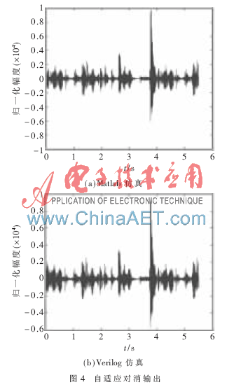 该去噪模块每19个时钟周期处理一个数据,并且在这19个时钟周期中对自适应滤波器6个系数进行更新。本设计采用高斯白噪声为测试噪声。自适应滤波器的Matlab与Verilog仿真图如图4所示。