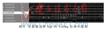 因为做FFT运算后的输出数据为复数,所以需要求模运算(即开平方运算)。本系统采用非冗余的循环算法[7]进行开平方运算,用简单的加减移位操作实现开平方运算,而且处理一个数据只需要N/2个时钟周期。由于FFT模块的输出数据为20 bit,故每隔10个时钟周期才能实现一次开平方运算;又因为ANC是每隔19个周期才输出一个数据,所以每隔19个周期刷新或者复位一次开平方运算模块,并且在每次复位后的第10个周期有开平方运算输出。为了联系后续模块,采用valid信号控制开平方运算模块的输出,只有valid=1时,输出才有效。其Verilog仿真的时序图如图6所示。