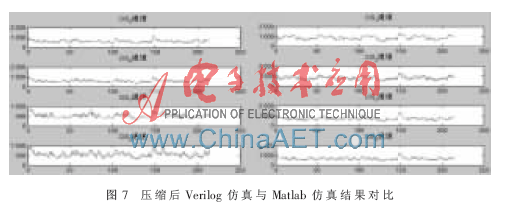 以上模块结构都采用Q15的数据格式进行可综合的Verilog HDL描述,并在Xilinx Spantan6系列FPGA上实现,资源占用情况为:整个系统占用5 014个slice,时序上整个系统的处理速度主要由自适应滤波器模块决定。用ModelSim进行功能仿真后,将仿真结果数据导入Matlab并与Matlab下的处理结果进行对比,最后各通道进行数据压缩后的结果对比如图7所示。