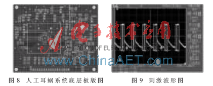采用经流片验证后的刺激芯片[8]进行联合仿真。根据耳蜗系统要求制作PCB版图(包括核心板与底板)。核心板主要包括FPGA、电池和数据采集模块(SD卡);底板主要包括麦克风、电源管理模块和刺激芯片模块,如图8所示。焊接芯片进行了系统联合仿真,通过示波器观察刺激芯片指定通道的刺激波形如图9所示。经计算一个脉冲刺激时间为26 ?滋s,刺激幅度为784 mV,与预期值相符。