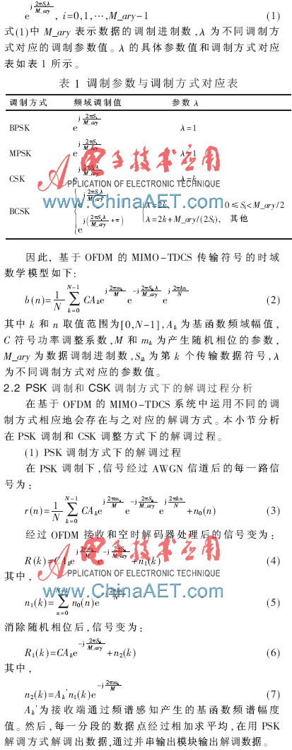 根据相关的文献,现有的TDCS调制方式主要有5种:双极性调制、BPSK、CSK、BCSK和正交编码调制。不同的调制方式具有不同的调制性能,MIMO-TDCS系统根据通信环境和通信性能指标要求,灵活地调整调制方式以满足不同通信需要。通过分析研究在傅里叶变换域中,不同调制方式可以统一为一个频域数学模型: