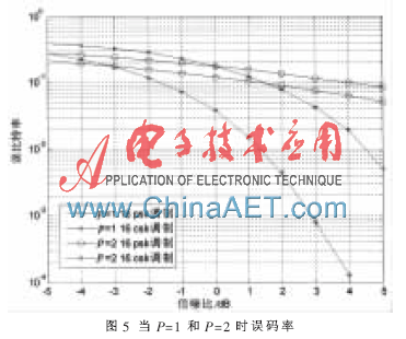 图5是选取子载波数N0=128,可用子载波为Ns=128,采用ZF检测接收方法,P值选取P=1和P=2的条件下的误码率性能。从P=1的曲线可见,在信噪比较小时,PSK调制性能优于CSK调制性能,当SNR=-3 dB时到达转折点,PSK调制性能与CSK调制性趋于一致;随着信噪比的不断变大,CSK调制性能改善的速率大于PSK调制,从而在大信噪比下CSK性能优于PSK性能。当信噪比SNR=4 dB时,在16PSK调制下P=1变到P=2误码率性能仅下降了0.036,在16CSK调制下误码率性能仅下降了0.019,而此时由P=1变到P=2频带利用率提升了一倍。