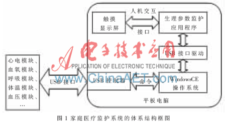 图1所示是基于平板电脑的家庭医疗监护系统的结构框图。将平板电脑作为主控系统利用USB接口的数据传输方式与生理参数采集模块进行数据通信,USB主控制器将采集的人体的心电、血氧、呼吸、体温、血压等主要生理参数通过内核中USB的驱动模块与操作系统交互,操作系统将其再传递给上层的监护系统的图形界面处理应用模块,外界可通过平板电脑的带触摸功能的显示屏实现与监护系统的人机交互,以达到实时监护效果。