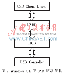 Windows CE的USB驱动可以详细地分为三层:上层的USB设备驱动程序,被称为USB Client Driver,对应具有USB接口的外围设备;中间层的USBD,即USB总线驱动;下层的主机控制器驱动[3],即HCD。如图2所示。