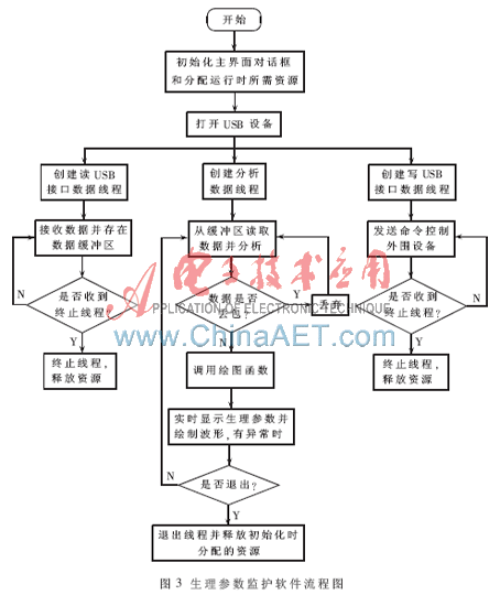 本系统采用VS2005集成开发环境,利用微软提供的基础类库MFC,以面向对象的程序设计和多线程的思想方法来完成生理参数监护上层应用软件的开发[6]。主要软件流程图如图3所示。
