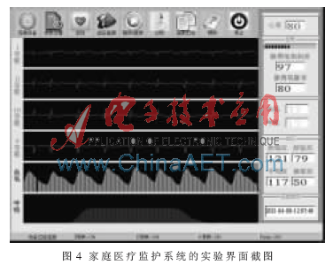 在实验室条件下进行测试,验证基于平板电脑的监护系统的可靠性、实时性、稳定性。如图4所示,运行监护界面软件,同时检测各个参数,均无出现丢包等数据传输问题,能实时地反应被监护者的血压、呼吸、血氧等人体主要参数及波形。实验表明该家庭医疗监护系统工作稳定,并能实现对人体六大参数的监护功能。