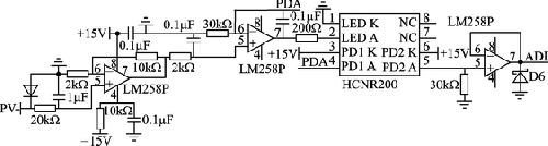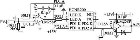 电动机在运转过程中每次只有两相通电(一相正向通电,另一相反向通电),因此每次只需要控制一个电流,将电阻安放在电源对地端就可以实现电流反馈,并实时监管。电流反馈的输出经滤波放大后送到DSP的ADC端口进行处理,每个PWM周期对电流进行采样,对速度(PWM占空比)进行控制。这里选用线性隔离放大器HCNR200对输出波形进行处理,电流信号检测电路如图5所示。