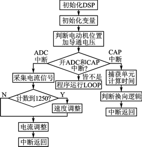 控制系统中控制任务的最终实现是靠软件来完成的。因此,在完成硬件设计的基础上,必须对软件进行设计。应用程序的好坏直接决定整个控制系统的质量和效率。电动机控制一般是一个快速过程,要求在一定时间内完成一系列的软件处理过程。例如,对电动机被控参数(转速、电流、电压等)的反馈信号进行采样、计算和判断并作出相应的处理。为了满足系统的实时性要求,控制系统需要用中断方式对实时性强的输入、输出进行监测。软件设计充分利用TMS320F28335的中断处理能力来完成电流采样、位置捕获及PWM波形产生等任务,ADC完成电流和电压的采样,CAP完成位置信号的捕获和换向逻辑的确定。软件任务主要包括主程序和各中断子程序,其流程如图7所示。