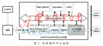 系统硬件平台结构如图2所示。系统采用Xilinx公司的XUPV5 LX110T FPGA开发板,内嵌MicroBlaze软核、以太网控制器、Flash、DDR等模块,通过PLB总线实现模块之间的交互通信。底层数据存储设备使用具有IDE接口的ATA硬盘,通过V5开发板的扩展接口与FPGA芯片相连,用户端通过访问网络实现对硬盘的远程访问。