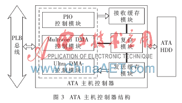 本文采用具有IDE接口的希捷ST340014A硬盘(40 GB)作为数据存储设备,依据ATA/ATAPI-6协议[2]完成了对ATA主机控制器的设计,并将其封装为IP核以方便集成到不同总线结构的ASIC或SoC系统中[3]。ATA主机控制器的结构如图3所示。