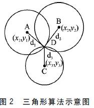 三边定位法:分别以已知位置的3个AP为圆心,以各个到待测标签的距离最近参考标签的距离为半径作圆。所得的3个圆的交点为D.三角形算法示意图如图2所示。