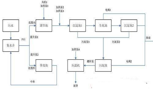 1)自动运行方式?控制系统根据集水井的液位高度,自动开启或关闭污水阀;集水井内PH计的设定范围,决定是否自动开启调节池或事故池;调节池的液位高度,限定自动控制提升泵1的运行;加药泵1依据PH计1令变频器控制加药量;根据电导率的测定值,自动控制电动阀门2的开启;变频器与溶解氧测定仪连锁控制风机2的鼓风量,溶解氧测定仪显示溶解氧含量,当溶解氧低于某值时自动报警;根据污泥池的液位高度,自动控制螺杆泵的启动;带式污泥脱水机自带报警显示?