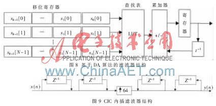 由于DA算法具有硬件资源占用少、结构紧凑、工作频率高等突出优点,所以半带内插滤波器和FIR内插滤波器均采用了该算法的结构。结构图如图8所示。