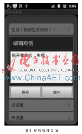 用户单击图2主界面上的“编辑短信”菜单后,执行PrepareSms类,该类继承Avtivity类,实现了OnClickListener接口。然后进入短信显示界面,通过自定义SelectSharedPreferencesDb类实例对象的getSMS( )方法读取sms_db.xml文件,并把短信内容显示在TextView上。单击短信显示文本框TextView,进入短信内容编辑界面,如图4所示。编辑完成后调用saveSMS()方法保存短信内容到sms_db.xml文件,代码如下: